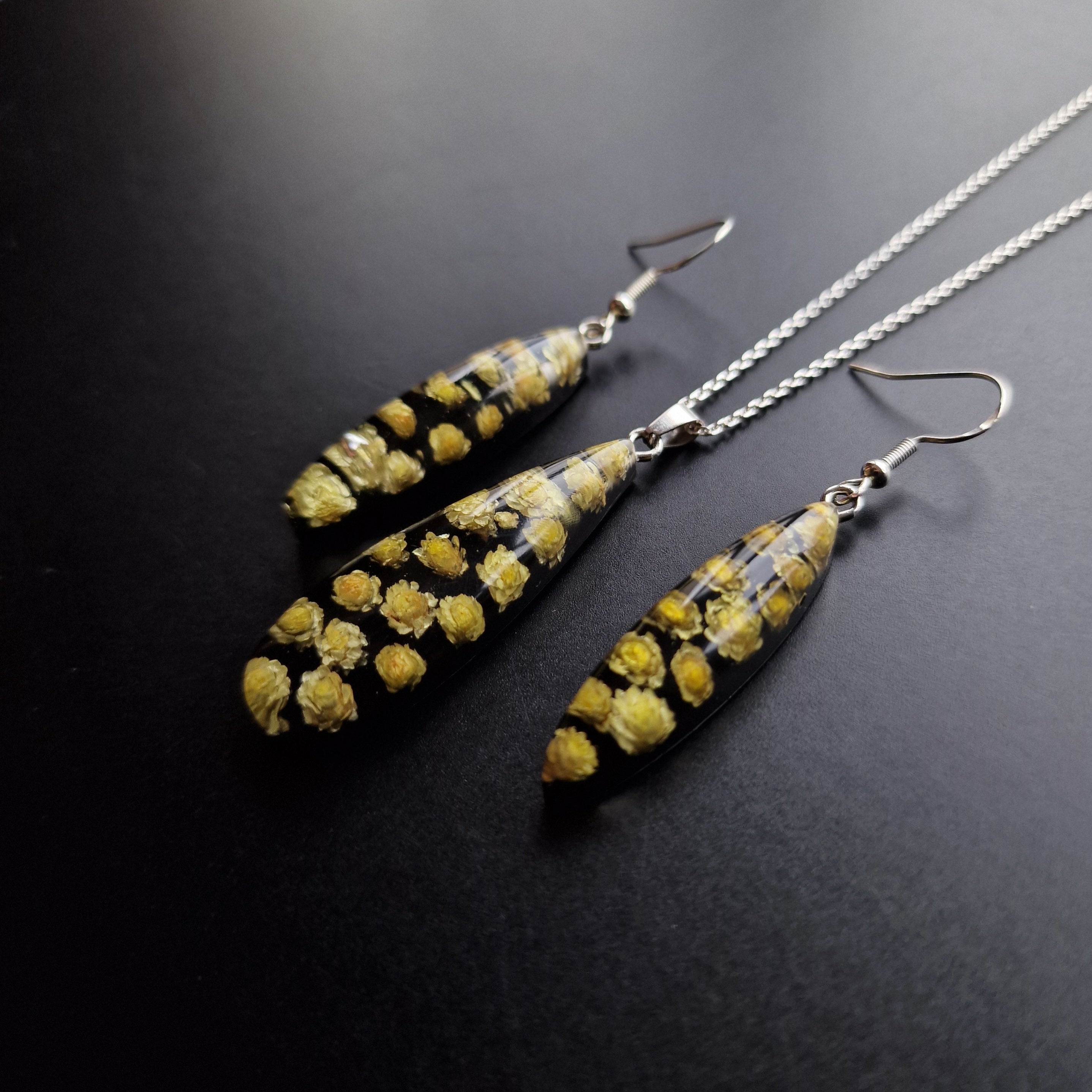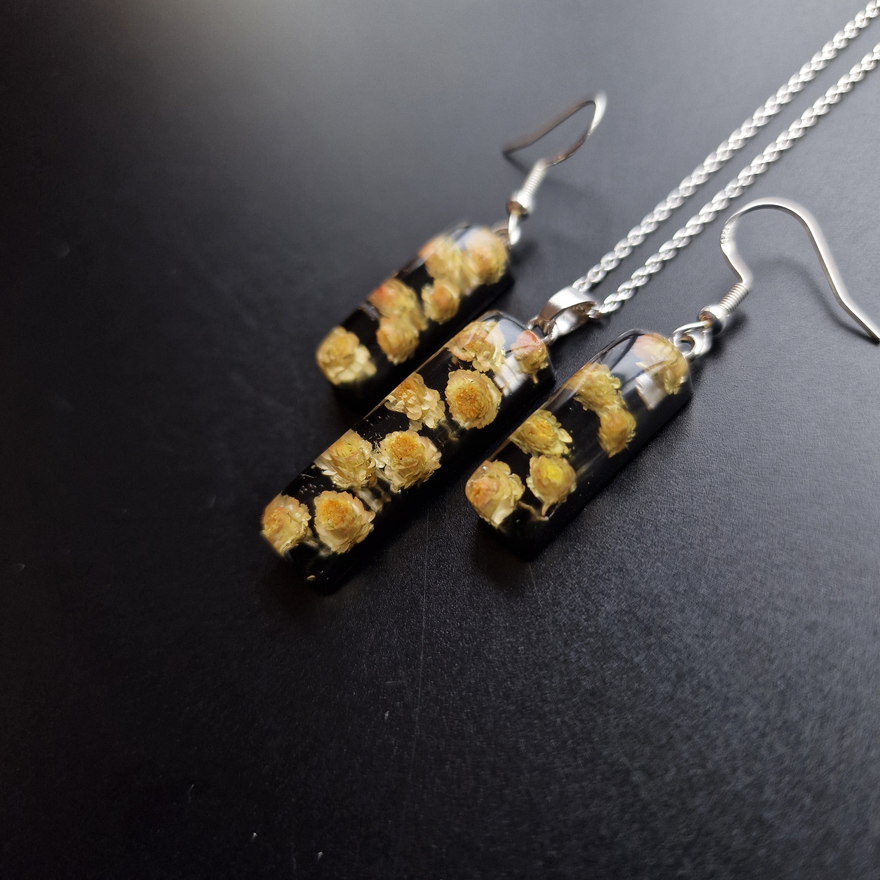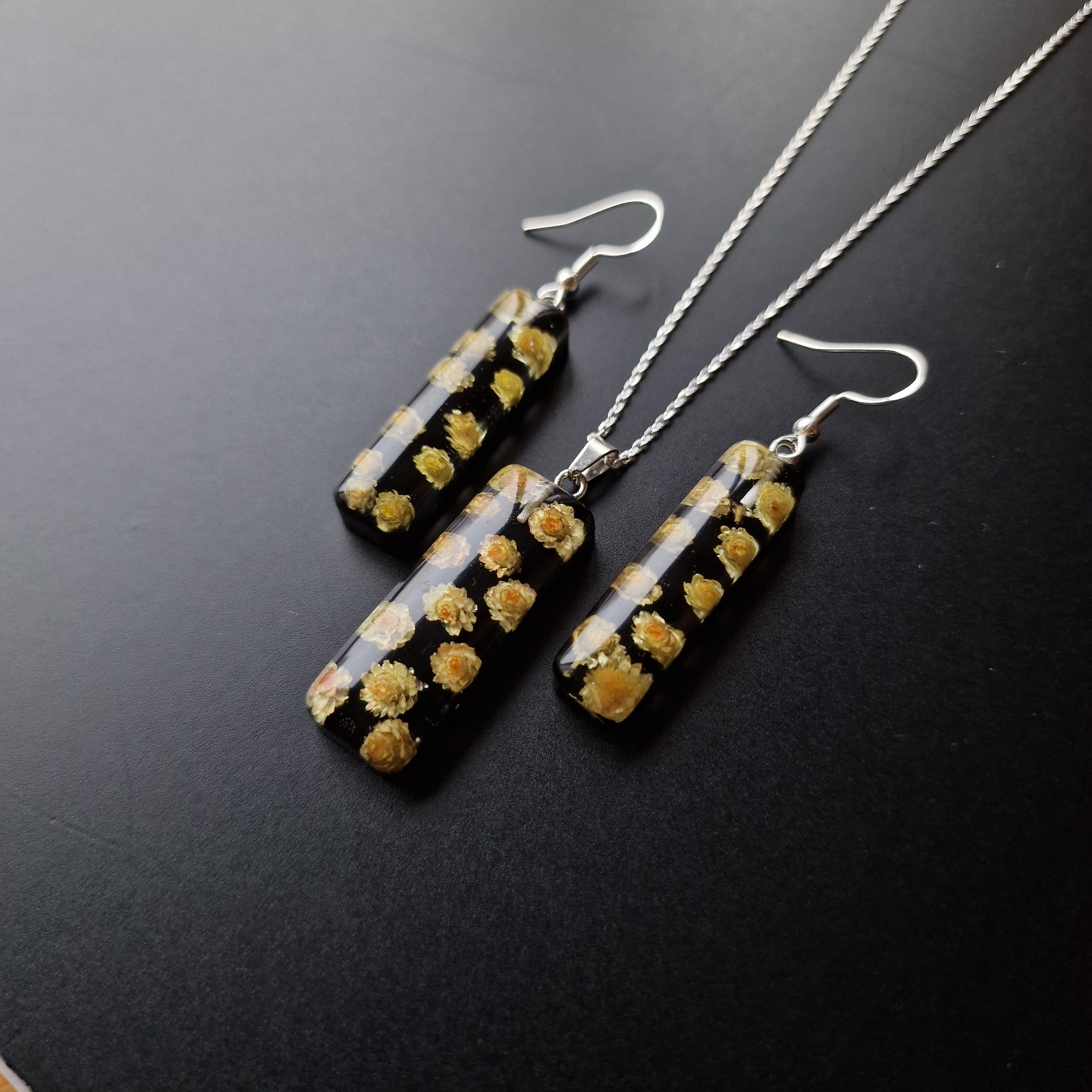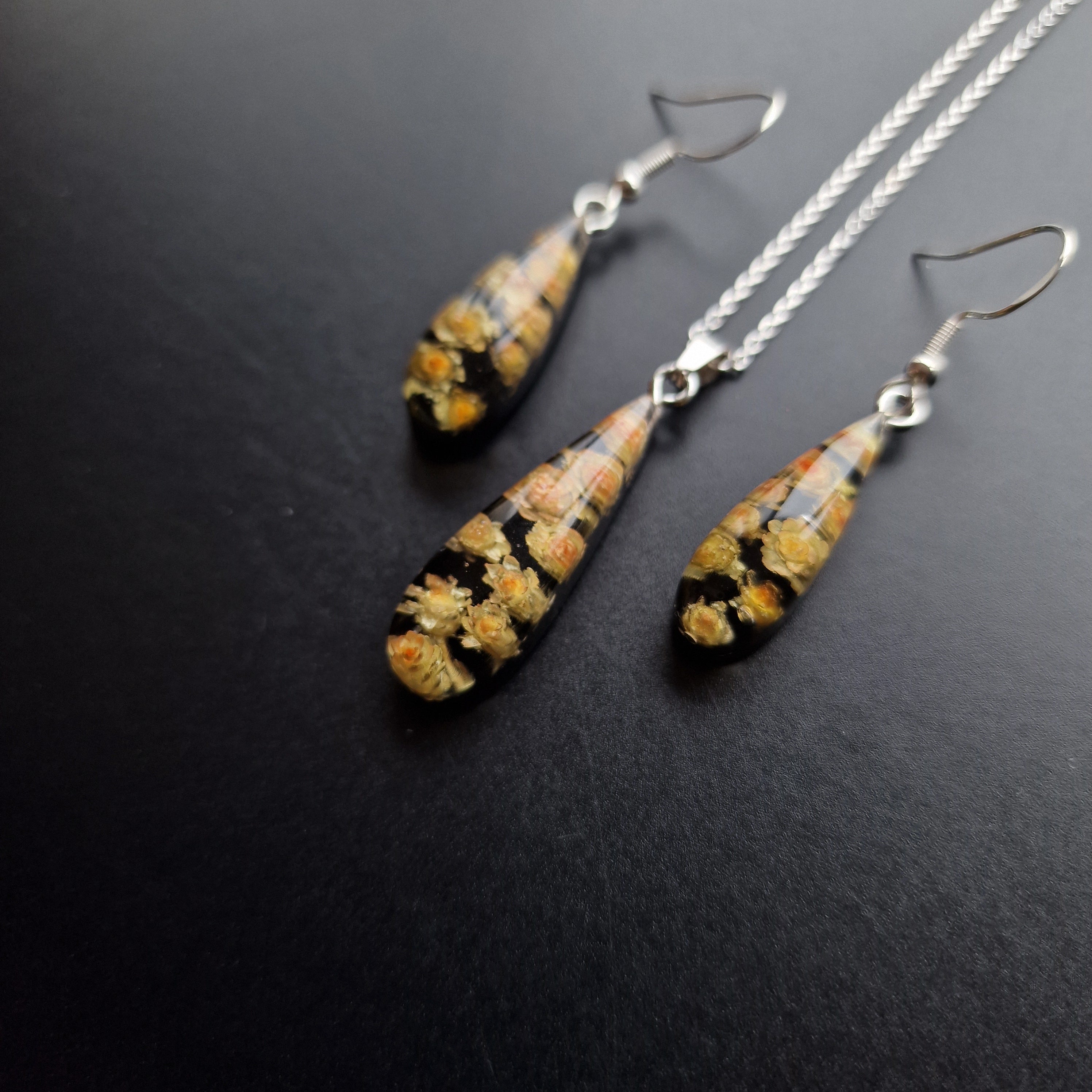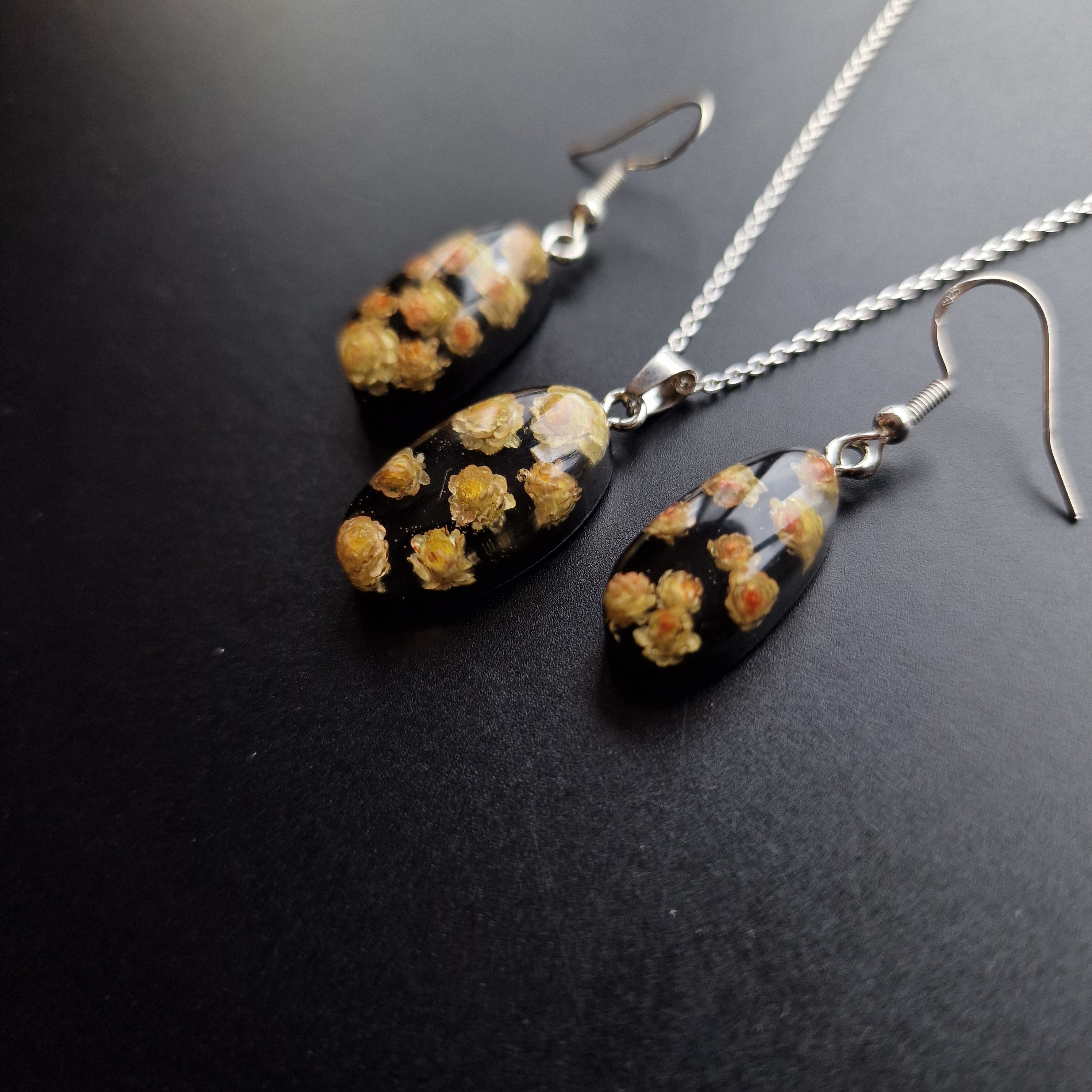 Handmade Resin Jewelry Set with Real Dried ‘Helipterum Roseum’ Flower & 925 Sterling Silver